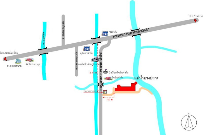 ด้านหน้าติดถนนซอยร่มเย็น 200 เมตร ลึกประมาณ 324 เมตร และติดแม่น้ำบางประกง 24 เมตร